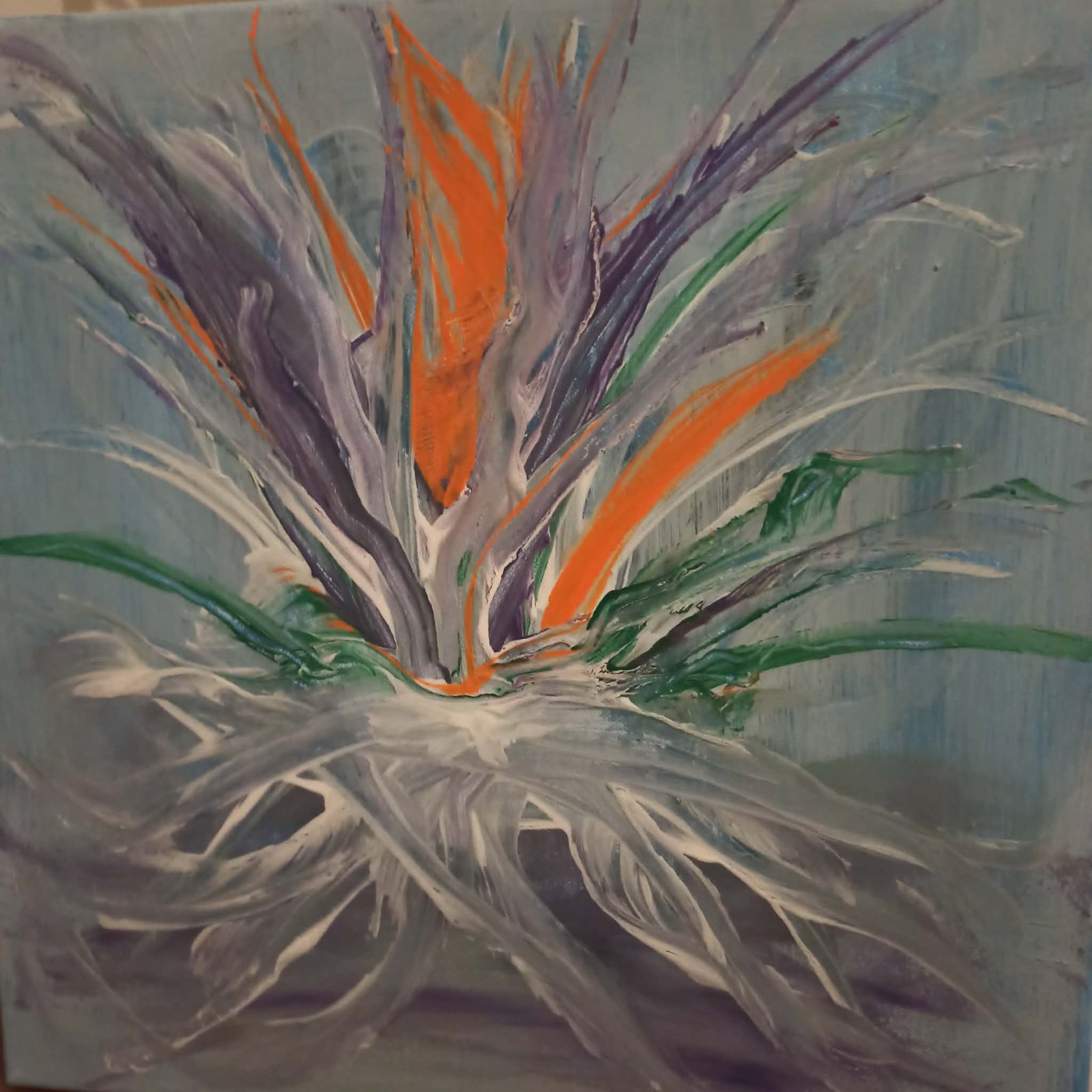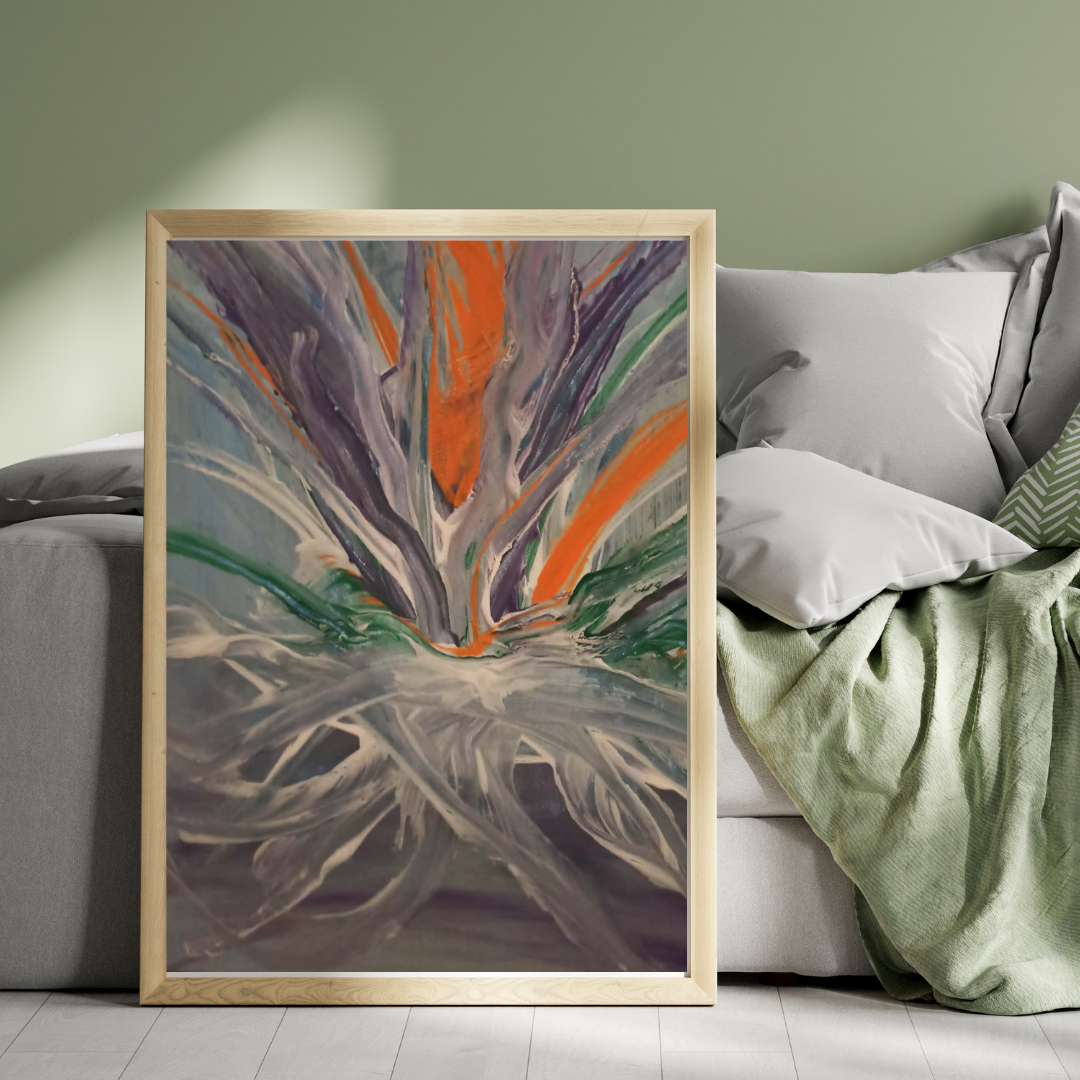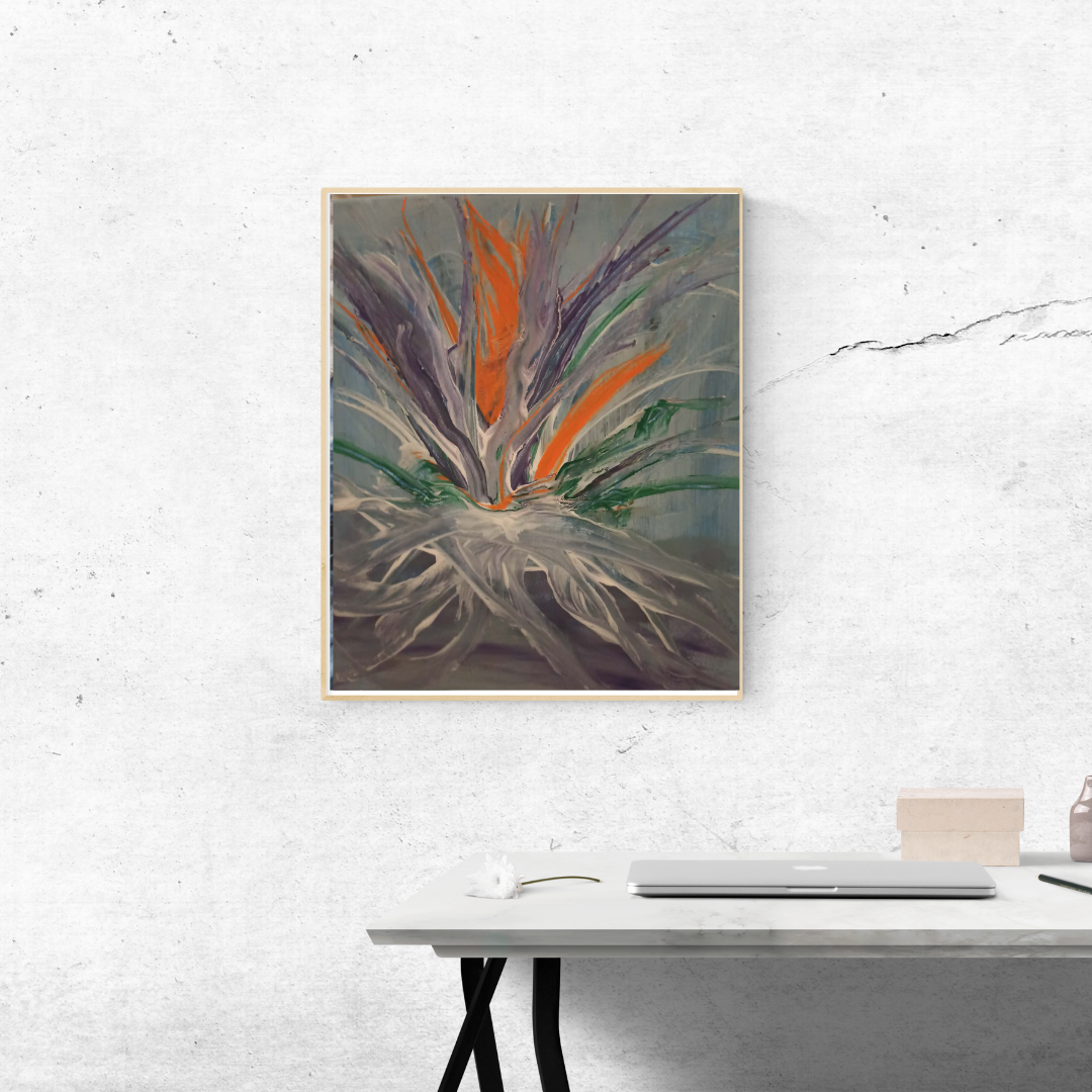 Ova apstraktna kompozicija odiše snažnom energijom i dinamikom. Centralni motiv podseća na egzotični cvet ili plamen koji izbija iz središta, koristeći upečatljiv kontrast između živopisne narandžaste i dubokih ljubičastih tonova.