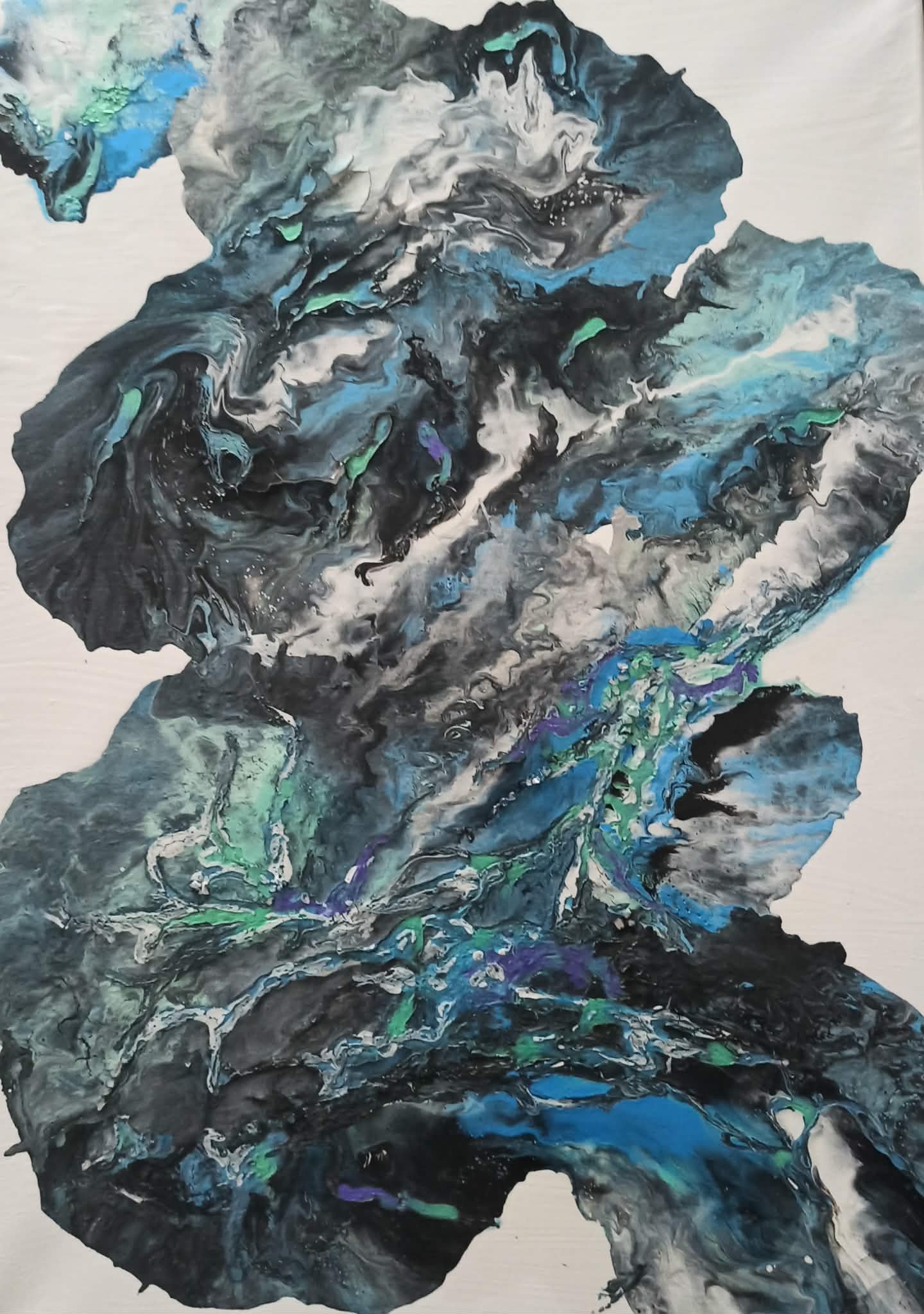 Ovaj rad istražuje organske forme kroz prelivanje hladnih plavih i tamnih tonova. Dinamične mrlje i fluidne linije stvaraju osećaj pokreta, podsećajući na neotkrivene dubine okeana ili beskrajni kosmos, dok tekstura daje slici dodatnu dimenziju.