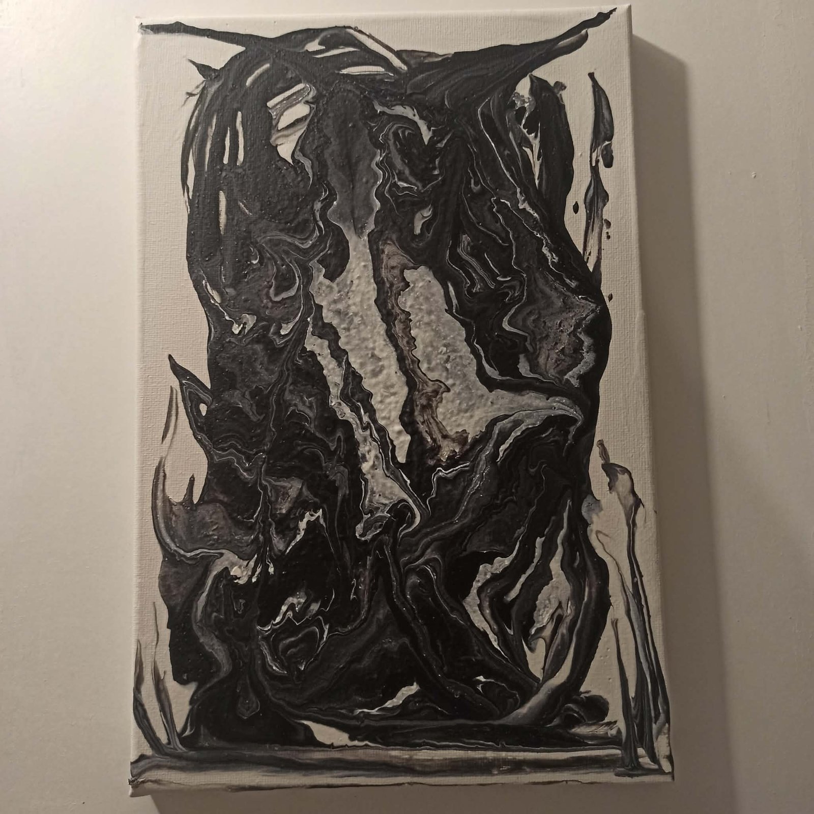 Ova monohromatska apstraktna slika istražuje snagu kontrasta između duboke crne i čiste bele boje. Tečne, organske forme koje se prelivaju jedna u drugu stvaraju utisak pokreta, poput dima ili mermernih šara. Kompozicija odiše misterijom i dramom, pozivajući posmatrača da pronađe sopstvene oblike u ovom vrtlogu senki. Minimalistička paleta naglašava teksturu i emociju, stvarajući snažan vizuelni identitet.