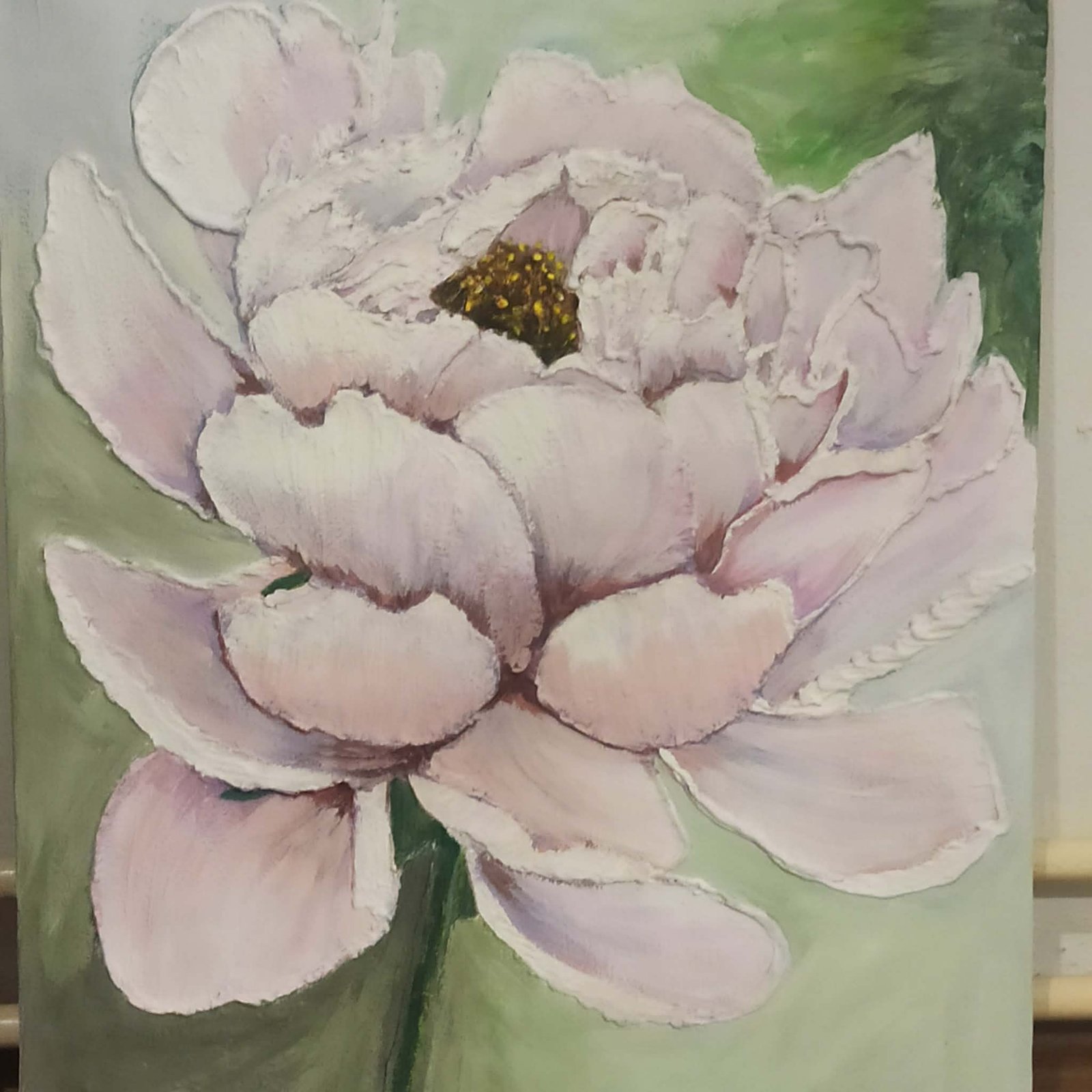 Elegantna slika sa izraženom reljefnom teksturom latica koja pruža 3D efekat. Nežni beli i pastelni tonovi stvaraju osećaj mira i harmonije u prostoru. Unikatni rad, akril na platnu.