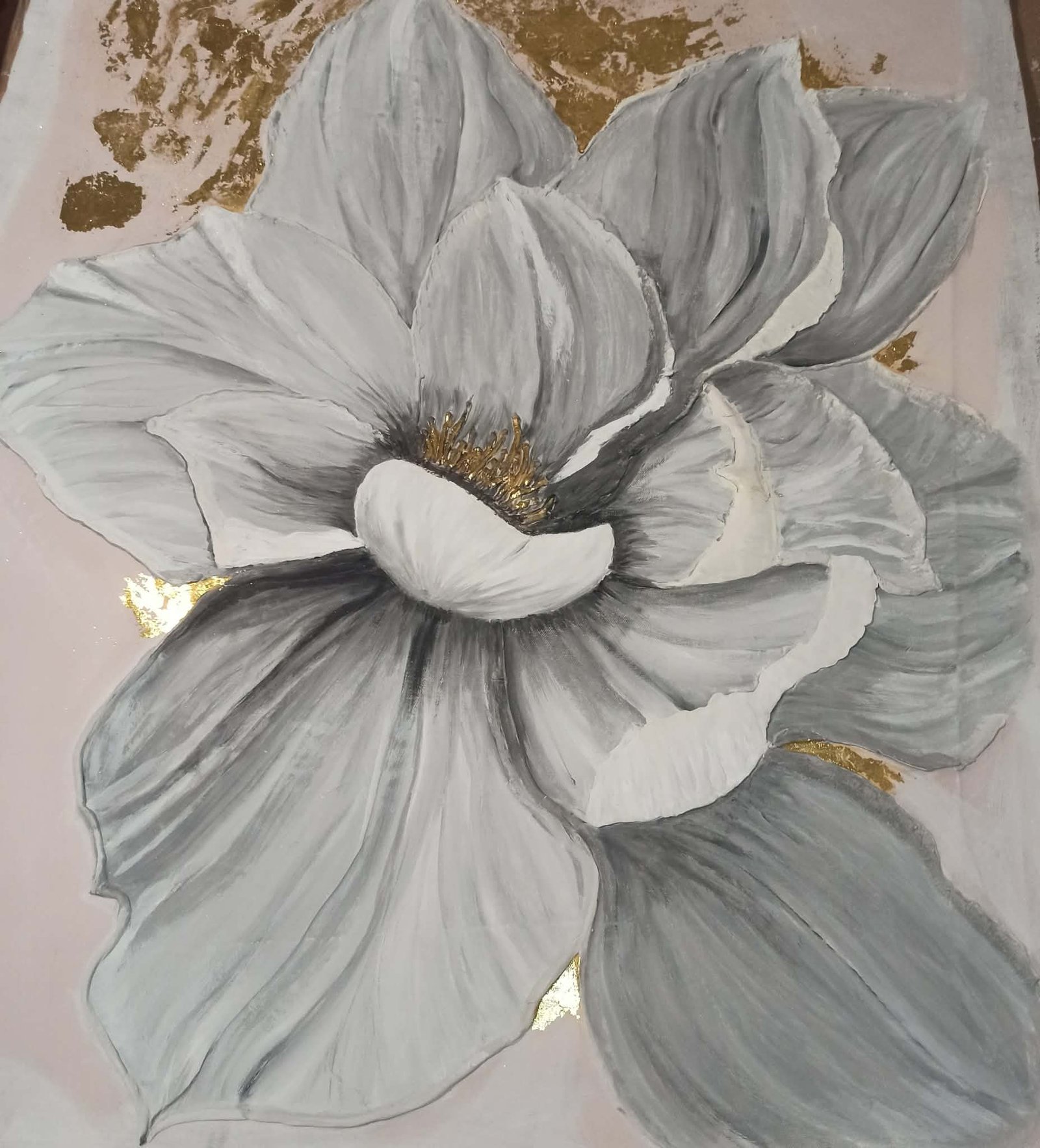 Ova slika predstavlja sofisticiranu interpretaciju cveta, gde se susreću nežnost prirode i luksuzni umetnički detalji. Dominantni sivi i beli tonovi na laticama, rađeni sa vidljivom teksturom, stvaraju snažan reljefni efekat. Poseban akcenat čine zlatni listići u pozadini i središtu cveta, koji daju kompoziciji dubinu i plemenit sjaj. Rad odiše modernom elegancijom i mirom, čineći ga savršenim spojem klasičnog motiva i savremenog minimalizma.
