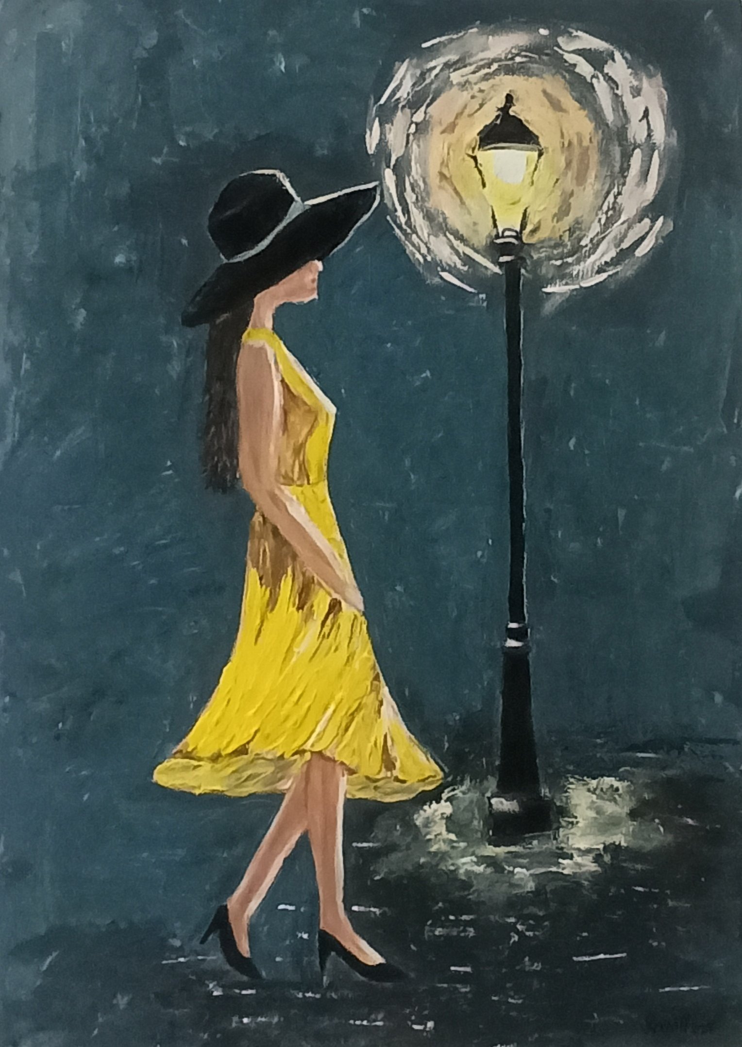 Tehnika: Impasto (naročito istaknuta tekstura na haljini i svetlosti lampe, što slici daje dubinu i trodimenzionalni efekat). Motiv: Elegantna dama u žutoj haljini pod toplim svetlom ulične svetiljke. Dimenzije: 50 x 70 cm. Materijal: Platno na blind ramu Slikar: Verona Recsó