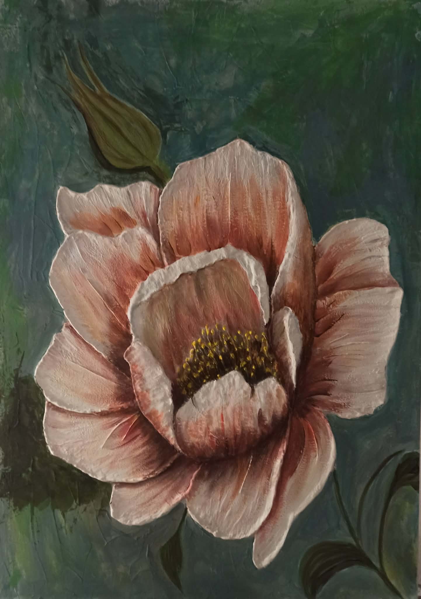 Ova slika odiše toplinom i vitalnošću, prikazujući cvet u punom sjaju uz nežni pupoljak koji simbolizuje novi početak. Bogata tekstura latica, naglašena tamnijim nijansama u osnovi, stvara utisak dubine i prirodne složenosti. Pozadina u smaragdno zelenim i plavičastim tonovima pruža savršen kontrast toplim tonovima cveta, dok suptilni svetli detalji u središtu unose svetlost u kompoziciju. Rad slavi ciklus prirode i lepotu svakog stadijuma cvetanja.