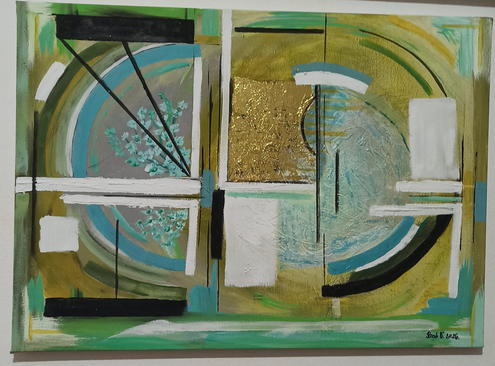 Otkrijte savršen balans između stroge geometrije i slobode prirode. Ovo unikatno, ručno slikano apstraktno delo kombinuje osvežavajuće nijanse mente i trave sa dubokim crnim konturama i naglašenim centralnim motivom u boji zlata.
